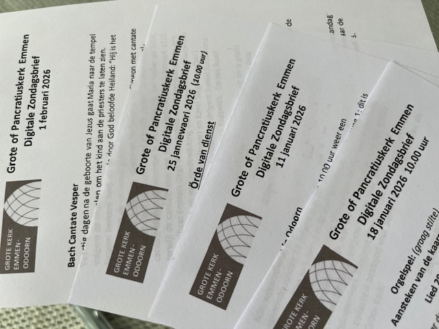 Wekelijks wordt in de kerk de Zondagsbrief uitgereikt en kan digitaal worden ontvangen, met daarop de orde van dienst, nieuws en mededelingen van onze Wijkgemeente Grote Kerk Emmen-Odoorn. Wilt u een digitaal of gedrukt exemplaar van de Zondagsbrief ontvangen, dan graag een bericht naar de redactie via e-mail: zondagsbrief@grotekerkemmen.nl.